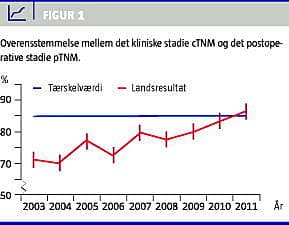 Indikatoren viser, hvor præcist de udredende afdelinger kan fastlægge det korrekte stadie før kirurgi, hvilket er afgørende for, at patienten tilbydes den bedste behandling. Som det fremgår af Figur 1 , er overensstemmelsen steget fra 70% i 2003 til 86% i 2011.