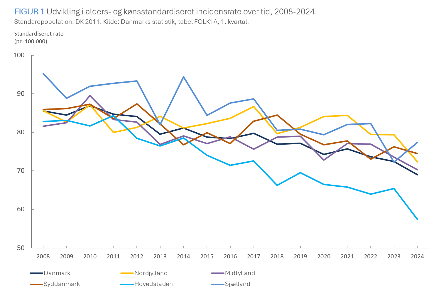 Særligt Region Hovedstaden skiller sig ud i denne sammenhæng. Som illustreret i Figur 1 er der siden 2014 observeret et tydeligt og vedvarende fald i den standardiserede incidensrate i denne region. Hvor de øvrige regioner oplever mere beskedne eller senere indsættende fald, er Region Hovedstaden gået markant ned i standardiseret incidens, og ligger i dag lavest blandt alle regioner.