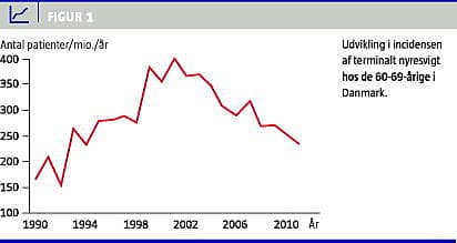 DNSL er en kvalitetsdatabase, der i høj grad anvendes til original epidemiologisk forskning; eksempler er beskrivelsen af cancerrisikoen og livstidsprognosen forbundet med glomerulonefritis [2]. Danmark var det første land, hvor der blev beskrevet en stabilisering af incidensen og en forbedring af prognosen af diabetisk nefropati [3, 4] samt en forbedret prognose hos patienter med polycystisk nyresygdom [5]. Den øgede incidens af nyresvigt hos patienter i storbyerne samt hos patienter med lave indkomster og korte uddannelser er blevet dokumenteret [6]. I 2010 blev der publiceret otte artikler med brug af DNSL's data. Ansøgningsskemaet for dataudtræk kan findes på DNSL's hjemmeside. DNSL har dokumenteret en øgning i prævalensen af terminalt nyresvigt, der blev behandlet med dialyse eller transplantation, fra 1.840 patienter i 1990 til 4.762 patienter ultimo 2011 (2.526 i dialyse, 2.236 transplanterede), mestendels fordi nye grupper, f.eks. ældre patienter, er taget i behandling. Etårs kombineret graf-tab og patientdød hos de transplanterede er faldet fra 21% til 5%, mens den justerede dialysedødelighed er halveret. Siden 2000 er der sket et bemærkelsesværdigt fald på ca. en tredjedel i incidensen af behovet for renal erstatningsterapi hos patienter i alderen 60-69 år (Figur 1 ). Det antages at være udtryk for en intensiveret profylaktisk indsats i primærsektoren, primært ved hypertensionsbehandling, og brug af reninangiotensinblokade.