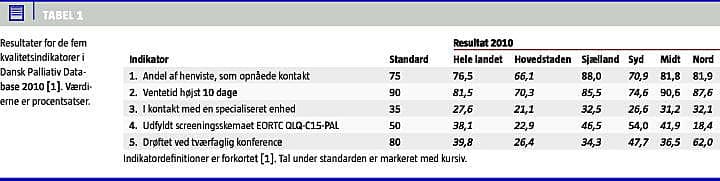 Resultaterne for de fem kvalitetsindikatorer er vist i Tabel 1 . Standarden angiver den grad af opfyldelse, der blev sat som målsætning. Kun en af de fem opstillede standarder blev opfyldt. Der var betydelige regionale variationer. Resultater opdelt på de enkelte enheder viste endnu større variation [1].