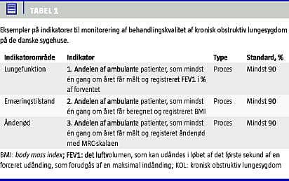 På sygehusene monitoreres kvaliteten af KOL-behandling i ambulatorierne ved registrering af, om der måles lungefunktion, body mass index , åndenød og rygevaner, samt om der tilbydes hjælp til rygestop og rehabilitering (Tabel 1 ). I forbindelse med akutte indlæggelser monitoreres andelen af forløb, hvor man behandler med noninvasiv ventilation (total samt i forhold til respiratorbehandling), og 30-dages-mortalitet. Fra almen praksis indberettes nu tilsvarende data fra KOL-årskontrollen, hvor man monitorerer de samme parametre som i ambulatorierne suppleret med forebyggende tiltag, f.eks. influenzavaccination.