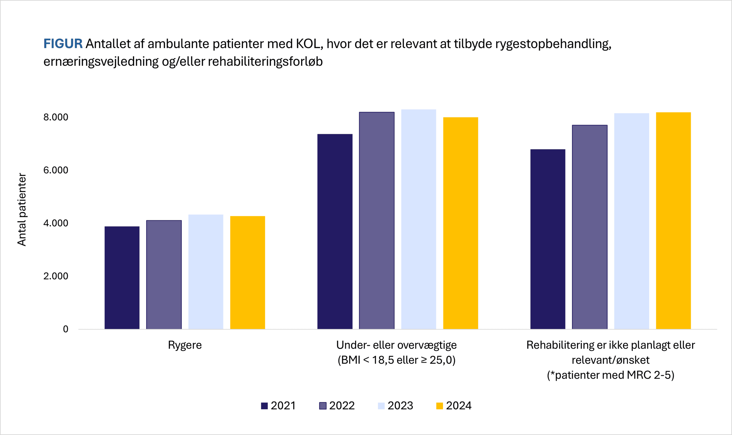 3. Rehabilitering: Kun tre af fem regioner tilbyder specialiseret KOL-rehabilitering, og under 300 patienter modtog det i 2024. Desuden gjaldt det for 69 % af de ambulante patienter med MRC grad 2-5, at de enten ikke fik tilbudt, ikke ønskede eller ikke gennemførte kommunal rehabilitering.