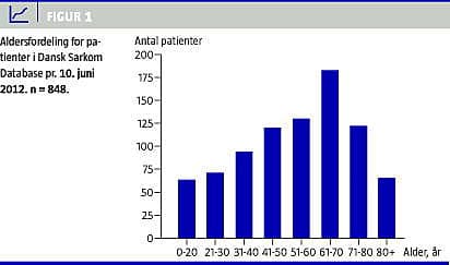 I Danmark forekommer der årligt ca. 300 nydiagnosticerede tilfælde af sarkomer, der udredes og behandles på tumorcentrene i København og Aarhus. Der findes ca. 70 histopatologiske undergrupper, som kan ses overalt i kroppen, dog overvejende i bevægeapparatet og med stor aldersspredning (Figur 1 ). Metastasering sker overvejende hæmatogent til lungerne. Behandlingen besluttes multidisciplinært og er primært kirurgisk. Supplerende kemoterapi gives ved visse typer, f.eks. osteogent sarkom og inoperable metastaser. Supplerende stråleterapi anvendes ofte efter resektion af intermediært og højmalignt bløddelssarkom.