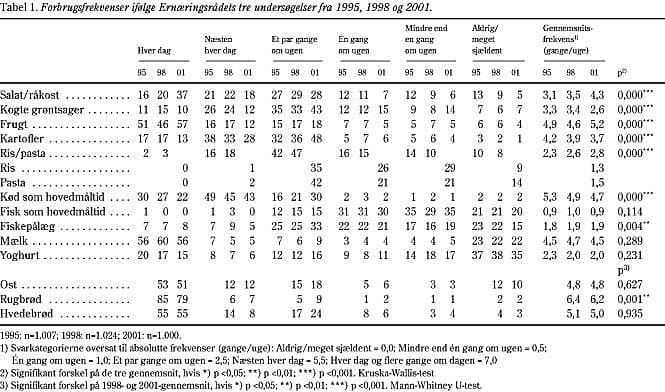 Forskelle i forbrugsfrekvenser mellem 1995, 1998 og 2001 for gruppen totalt samt mellem mænd og kvinder og for forskellige aldersgrupper blev testet ved sammenligning af gennemsnitsfrekvenser ved hjælp af Kruskal Wallis-test (non-parametrisk). Statistikprogrammet SPSS (version 10.0) blev anvendt til dataanalysen.
