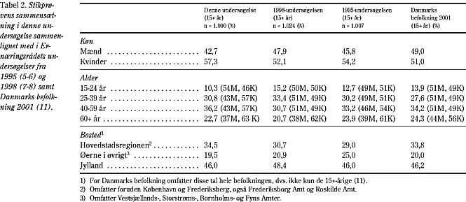 Stikprøvens sammensætning med hensyn til køn, alder og geografisk fordeling var rimelig repræsentativ i forhold til landets samlede voksne befolkning, mens populationernes sammensætning i henholdsvis 1995, 1998 og 2001 ikke var helt identiske (Tabel 2). Betydningen af korrektion for køns- og aldersforskelle samt for den geografiske fordeling mellem undersøgelsesårene blev testet og fundet negligeabel, idet de absolutte gennemsnitsfrekvenser for de enkelte fødevarer forblev uændrede eller ændrede sig minimalt efter justeringen (10). Desuden blev resultaterne opgjort fordelt på køn og alder, og det viste sig, at de fundne ændringer i forbrug gjaldt for begge køn og på tværs af aldersgrupperne.