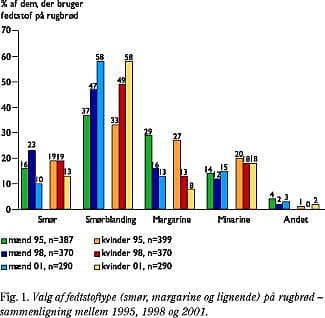 Resultaterne for forbruget af fedtstof på brød viser, at markant flere (40% mod 22% i 1995), både mænd og kvinder, ikke bruger fedtstof på rugbrød. Den samme udvikling ses for fedtstof på franskbrød/grovbrød (10). Blandt dem, der bruger fedtstof på brød, er der sket en ændring i valget af fedtstoftype, idet stadig flere bruger smørblanding (fx Kærgården) (58% i 2001 mod 48% i 1998 og 35% i 1995, for rugbrød). I 1995-1998 skete det øgede tilvalg af smørblanding især på bekostning af margarine, men i indeværende periode især på bekostning af smør (Fig. 1).