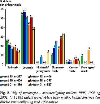 Udviklingen i valget af mælke- og fedtstoftype følger tendensen i den foregående periode, idet flere vælger de magre frem for de fede mælketyper, og flere fravælger fedtstoffet (smør, margarine o.l.) på brødet. Forbrugsfrekvensen for mælk er uændret siden 1995, men blandt dem, der drikker mælk, er der blevet flere både mænd og kvinder, som drikker de magre mælketyper - heriblandt den nye mælk med 0,5% fedt (mini/jerseymælk). I 2001 er der således 42% mod 28% i 1998, der drikker mager (kærne-, skummet- og mini/jerseymælk) frem for fed mælk (Fig. 2).
