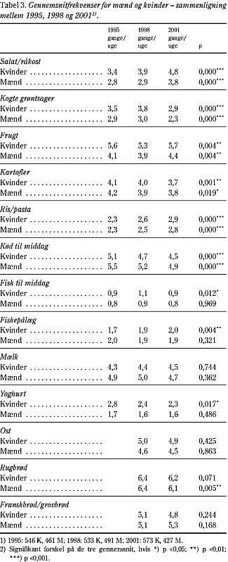 Resultater: Generelt var de mest markante ændringer i perioden 1995-1998 fortsat frem til 2001. Der var således et signifikant hyppigere forbrug af salat/råkost og ris/pasta, mens der for kartofler og for kød som hovedmåltid var sket et signifikant fald. Desuden var frugtindtagelsen steget i perioden 1998-2001. Ændringerne udgjorde 13-28% af gennemsnitsfrekvenserne. Tendensen i valget af mælke- og fedtstoftype var også fortsat frem til 2001. Således drak signifikant flere (42% mod 28% i 1998) de magre (kærne-, skummet-, mini/jerseymælk) frem for de fede mælketyper, og signifikant flere undlod nu at bruge fedtstof på brødet (for rugbrød 40% mod 22% i 1995).