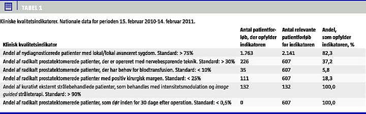 Den første årsrapport er i sin form, sit indhold og sin komplethedsgrad præget af sin debut. Resurserne til indberetning har måttes findes på de enkelte afdelinger. Ud af 23 registreringspligtige urologiske og onkologiske afdelinger har 13 en komplethed på over 70%. Af Tabel 1 fremgår det, at alle kvalitetsindikatorerne for de registrerede forløb er opfyldt på nationalt niveau.