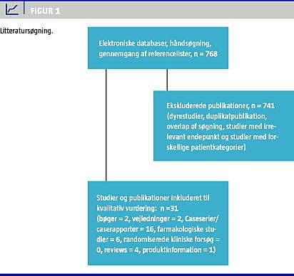 Til denne oversigtsartikel er der søgt på PubMed med søgeordene: anaesthesia og anesthesia AND lactation, AND breastfeeding samt de enkelte stoffer i kombination med lactation og breastfeeding . Derudover er referencerne fra de fundne artikler gennemset for relevante artikler. Søgningen har været begrænset til litteratur om mennesker på sprogene engelsk, dansk, svensk og norsk. Der er fortrinsvis inkluderet artikler fra 1990 og frem, men hvor materialet har været sparsomt, er ældre artikler medtaget. Den nævnte databasesøgning, håndsøgning og gennemgang af referencer frembød i alt 768 potentielle referencer. Heraf blev 737 ekskluderet (dyrestudier, andre patientkategorier og studier med fokus på fostre eller andre irrelevante endepunkter), og 31 referencer blev inkluderet (Figur 1 ).