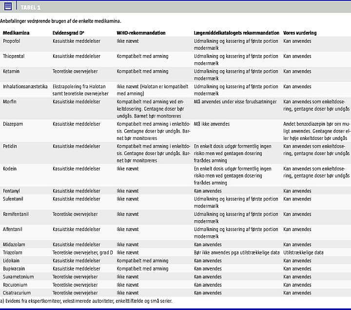 Indtil anden viden foreligger, bør anvendelse af de forskellige farmaka baseres på sund omtanke og uden ukritisk udmalkning og kassering af modermælk. Fordelene ved hurtig genoptagelse af amning postoperativt synes i høj grad at opveje de potentielle ulemper. Mange af de eksisterende vejledninger på området er således ikke evidensbaserede, og der synes ikke at være grundlag for den hidtidige konservative praksis med kassering af modermælk. WHO-rekommandationerne er efter vores opfattelse et bedre bud på en fornuftig praksis end en række andre mere lokale anbefalinger.