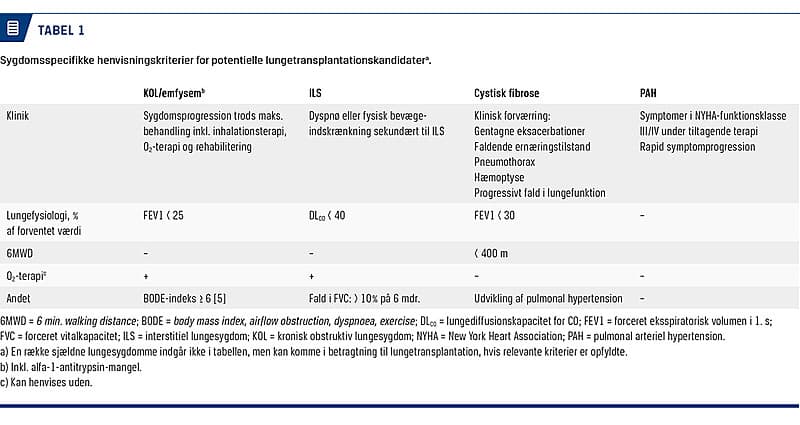 Vurdering af patienterne til LTx er kompleks, og lungesygdommens sværhedsgrad skal balanceres med evt. komorbiditeter og den forventede overlevelsesgevinst, hvorfor følgende generelle indikationer skal være opfyldt, for at patienten kan komme i betragtning [4]: 1) Patienten vurderes at have > 50% risiko for at dø af lungesygdommen i løbet af to år. 2) Der er overvejende sandsynlighed for, at patienten vil kunne overleve > 90 dage efter LTx. 3) Der er overvejende sandsynlighed for, at patienten vil kunne overleve fem år efter LTx set fra et almentmedicinsk synspunkt, dvs. ingen alvorlig komorbiditet på tidspunktet for LTx. Da donororganpuljen er begrænset, er det væsentligt, at potentielle kandidater til LTx selekteres konsistent og efter gældende internationale retningslinjer. LTx-udredningen har til formål at vurdere, om patienten er tilstrækkelig syg til LTx, og om der foreligger eventuelle kontraindikationer. At stå på venteliste til en LTx er en dynamisk proces, og alle patienter vurderes løbende mht. sygdommens sværhedsgrad, optimal behandling og nye komorbiditeter/komplikationer m.m. Hvis en patient indstilles til LTx, er ventetid og sygdomsprogression som oftest uundgåelig. Det er således af stor vigtighed, at patienter udredes og henvises til LTx i tide specielt ved lungesygdomme med et hastigt progredierende forløb (f.eks. idiopatisk pulmonal fibrose). Af Tabel 1 fremgår de anbefalede sygdomsspecifikke henvisningskriterier for potentielle kandidater til LTx.