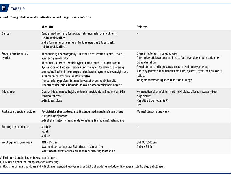 LTx er en kompliceret behandling med en betydelig peri- og postoperativ mortalitet [6]. Afdækning af alle komorbiditeter og kontraindikationer er vigtig for at udfærdige en risikovurdering, inden der foretages LTx. Kontraindikationerne inddeles i absolutte og relative (Tabel 2). En absolut kontraindikation er tilstrækkeligt til at afslå LTx, mens summen af flere relative kontraindikationer også kan medføre, at LTx ikke kan tilbydes.