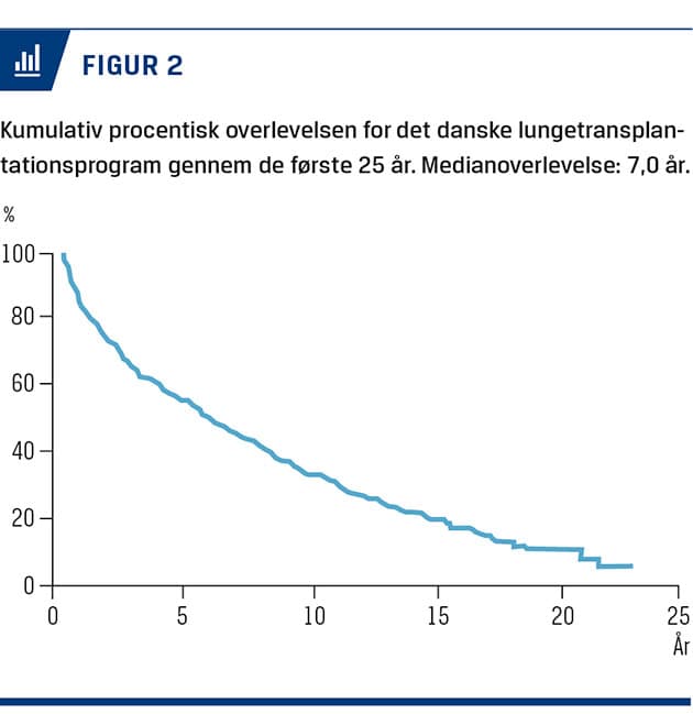 Hovedparten af patienterne opnår et godt resultat med en forbedret overlevelse og en øget livskvalitet som følge af en bedret lungefunktion, som overstiger niveauet af lungefunktionen før LTx. Desværre er overlevelsen efter LTx fortsat blandt de laveste ved transplantation af solide organer [3]. Dette skyldes formentlig en kombination af flere faktorer, bl.a. at lungerne har direkte kontakt til omgivelserne, og at højere doser immunsuppression er nødvendige, hvorved der også er en øget risiko for infektioner og bivirkninger. Et- og femårsoverlevelsen efter lungetransplantation ligger på hhv. 90% og 50-55% ifølge internationale opgørelser, det svarer til en medianoverlevelse på 6,1 år [3]. I Danmark er femårsoverlevelsen omkring 55%, og medianoverlevelsen er på 7,0 år (Figur 2) [9, 16].