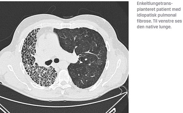 Lung transplantation (LTx) has been performed in Denmark since 1992, and chronic obstructive pulmonary disease and interstitial lung diseases are the major indications. All candidates are subject to an intensive evaluation before being accepted for LTx. Follow-up after transplantation is life-long and includes immunosuppressive medication with a high risk of side effects. The median survival in Denmark