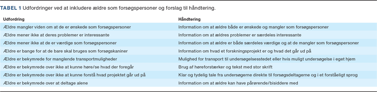 Der er mange ting, der kan forhindre ældre i at deltage i forskning, men det viser sig, at det er præcis det samme, der forhindrer yngre i at melde sig, nemlig at de ikke har tid, har problemer med helbredet, transportproblemer, sproglige problemer m.v. [3, 5] (Tabel 1). Desuden afholder manglende viden om kliniske studier nogle fra at henvende sig, da de er bange for blot at være forsøgskaniner, der skal afprøve ny medicin uden at vide, om det er sikkert og effektivt, eller at det er for risikabelt deres alder taget i betragtning [6].