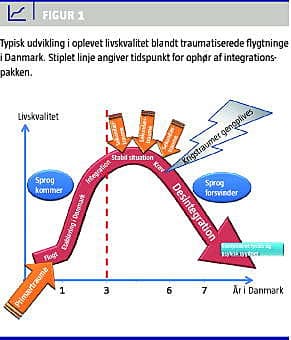 Drevet af tiltagende symptomer på PTSD jagter patienterne uroligt en hjælp og en diagnose, som ingen kan give dem. De er patienter uden speciale, de har ingen diagnose at hvile sig på, og de ender som funktionelle kronikere: indadvendte, forbitrede, håbløse, vredladne og apatiske og starter på en karruseltur i sundhedssystemet i jagten på en somatisk diagnose og behandling. En meget høj andel af disse patienter, som bliver henvist til klinikken med somatiske klager, har vist sig at have uerkendte krigstraumer. I stedet for at fortsætte integrationen falder patienten tilbage i rollen som frygtsom isoleret flygtning, og stik imod målet mister disse patienter de allerede opnåede færdigheder (Figur 1). Fra en lovende integrationsproces befinder patienten sig pludseligt i en situation, hvor en reintegrationsproces vil kræve en særlig og dyr koordineret indsats, der inddrager både somatiske, sociale og psykiske faktorer.