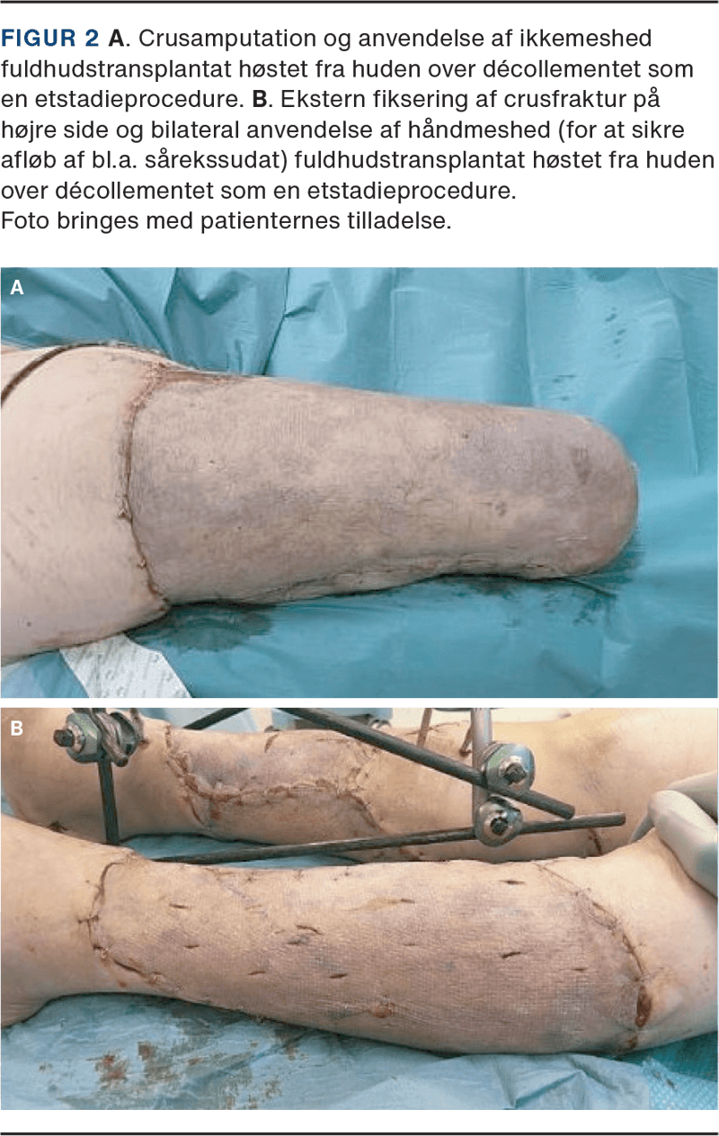 Den grundlæggende behandling af patienter med décollement inkluderer en grundig ABCDE-gennemgang og behandling af livstruende tilstande. Dertil inkluderer behandlingen ekstremitetsbevarende intervention i form af débridement af avitalt væv, revaskularisering og stabiliserende behandling af underliggende fraktur, hvis sådanne skader er til stede [1, 15]. Herefter kræves der ofte rekonstruktion af det involverede anatomiske område, som kan finde sted under samme operation som débridement og eventuelt behandling af en underliggende fraktur.