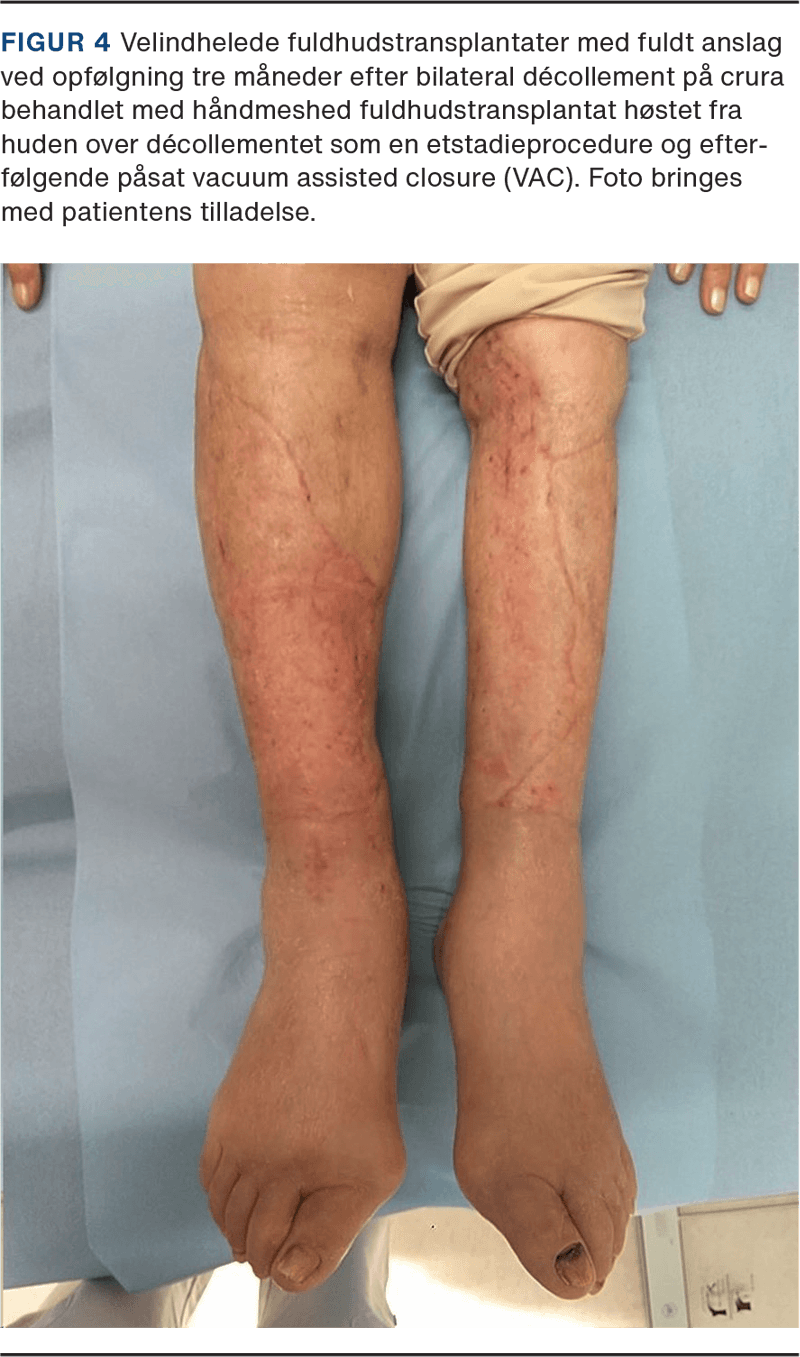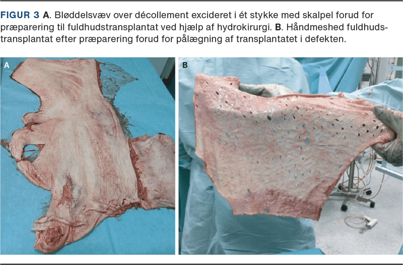 I de senere år anvendes i højere grad fuldhudstransplantat høstet fra det involverede væv som en etstadieprocedure, hvor høst og pålægning af transplantatet foregår under samme operation (Figur 2) (Figur 3). Årsagen til, at der i dag langt overvejende anvendes fuldhudstransplantat, er bl.a. den øgede tendens til skrumpning af et delhudstransplantat med øget risiko for kontraktur og dermed påvirkning af områdets funktionalitet. Dette har især betydning ved lokalisation over et led. Delhudstransplantat kan desuden forringe det æstetiske udtryk grundet det tyndere dække og har ringere mekanisk styrke [24]. Desuden reducerer en etstadieprocedure behovet for flere operationer og fremskynder helingsprocessen.