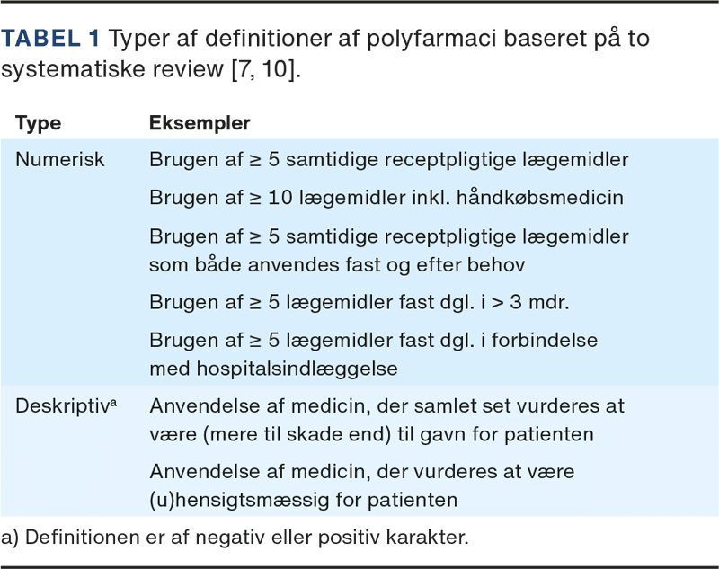 Der er forskel på, hvor mange lægemidler de numeriske definitioner er baseret på. I forskellige review er der angivet 2-11 lægemidler [10], fem, seks, syv eller ti lægemidler [7] eller fire eller flere lægemidler [13]. Sundhedsdatastyrelsen udgav i efteråret 2022 en ny rapport over andelen af befolkningen i behandling med polyfarmaci [14]. Her defineres polyfarmaci som samtidig brug af mindst fem lægemidler indløst på recept, hvormed håndkøbsmedicin ikke medregnes [14]. Andre differentierer den numeriske definition af polyfarmaci på baggrund af sværhedsgraden ved brug af begreber som f.eks. mindre polyfarmaci ved samtidig brug af 2-4 lægemidler og større polyfarmaci ved brug af fem eller flere lægemidler [10] samt »overdreven polyfarmaci« eller »hyper-polyfarmaci« ved samtidig brug af ti eller flere lægemidler [8, 9]. Der er desuden blevet argumenteret for, at i takt med at befolkningen bliver ældre, mere kronisk syge og anvender mere medicin, kan det være hensigtsmæssigt, at den numeriske grænse for, hvad vi definerer som polyfarmaci, flytter sig [9]. Således har ældre numeriske definitioner af polyfarmaci angivet samtidig brug af to eller flere lægemidler som værende polyfarmaci, mens svær polyfarmaci tidligere har været angivet som værende brug af fem eller flere lægemidler [12].
