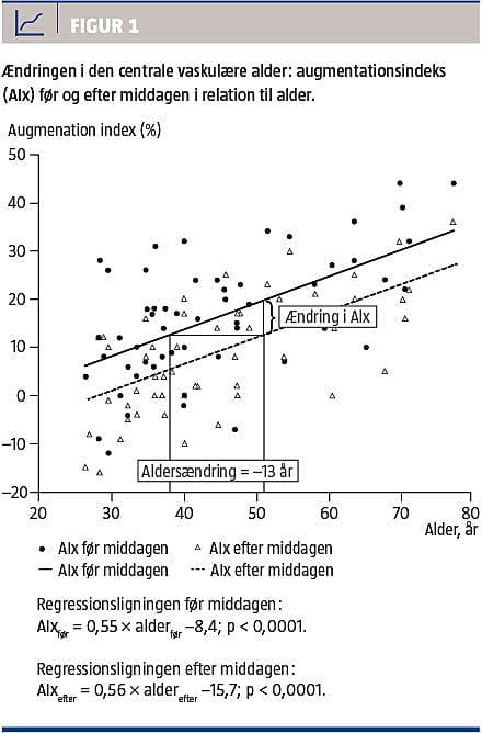 Den centrale vaskulære aldersændring efter middagen var –13 år. Dette er baseret på de lineære regressionsligninger for AIx før og efter middagen i relation til alderen (Figur 1). AIx ændredes svarende til forskellen i skæringspunkternerne med figurens Y-akse, dvs. –8,4% -(–15,7%) = 7,3%. Denne ændring svarer til en aldersændring på X-aksen, og afhænger af hældningen før middagen svarende til øverste regressionslinje, dvs. 0,55%/år. Aldersændringens udregning bliver således: 7,3% = 0,55%/år × alder → alder = 13 år.