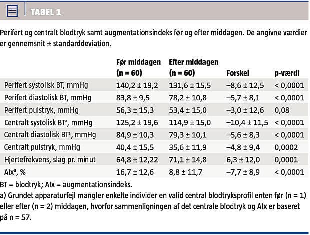 Tiden mellem undersøgelserne før og efter middagen var 4 ± 0,7 timer, og forskellene i blodtryk fremgår af Tabel 1. Hjerterytmen var steget, mens alle perifere og centrale blodtryk samt AIx var lavere efter middagen. Dog var faldet kun grænsesignifikant for perifert pulstryk. Elleve (18%) forsøgsdeltagere havde hypertension før middagen mod ni (15%) efter middagen (p = 0,62). Otte (13%) deltagere havde postprandial hypotension.