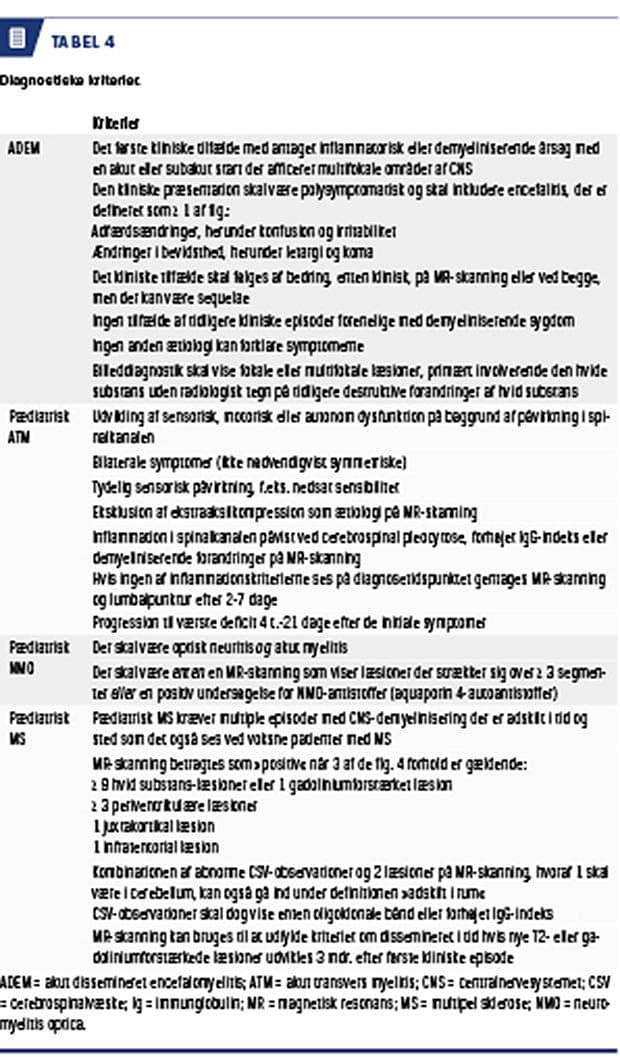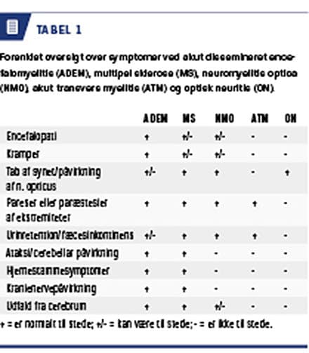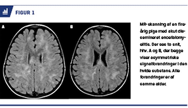 ADEM er karakteriseret ved akut opstået polyfokal CNS-udfaldssymptomer, inklusive encefalopati. Dette ses på MR-skanning ved multifokale læsioner, typisk af samme alder, mest udtalt i hvid substans (Figur 1).