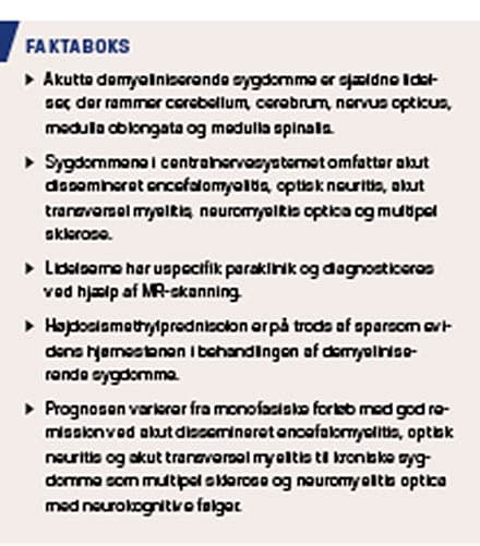 Christensen PS, Østergaard JR. Akut dissemineret encefalomyelitis. Ugeskr Læger 2008;170:1839-42.