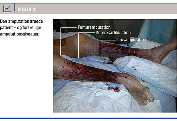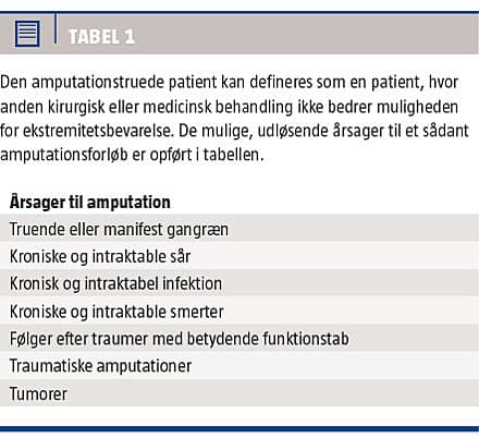 Større, ikketraumatiske underekstremitetsamputationer (UA), som omfatter amputationer over ankelniveau (Figur 1), er forbundet med høj mortalitet og morbiditet. I en dansk opgørelse fra 2009 fandt man, at 30% af patienterne døde inden for 30 dage efter operationen (perioperativ mortalitet) [1]. Reamputationshyppigheden ses at være tilsvarende høj [2, 3] og med langvarige indlæggelsesforløb til følge [2]. I undersøgelser fra udlandet er der fundet de samme udfordringer på området [4, 5]. Patienter, der henvises til amputation på en ortopædkirurgisk afdeling, er ofte ældre og komorbide patienter, som får foretaget amputationer pga. fremskreden arteriosklerose med iskæmi eller anamnese med længerevarende, ofte dysreguleret, diabetes med inficerede og nekrotiske fodsår [1]. Denne artikel har til formål at belyse udvalgte områder af hospitalernes behandling af den amputationstruede patient med arteriosklerotisk eller diabetisk baggrund. Amputationsforløb pga. traumer eller tumorer gennemgås ikke.