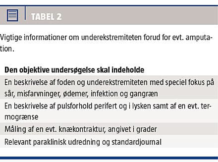 Indikationen for amputation (Tabel 1), det valgte amputationsniveau og patientens forventninger til forløbet skal gennemgås med patienten og evt. pårørende. Forud for indgrebet skal der foreligge informeret samtykke til amputation på det aftalte niveau. Vævets vitalitet vurderes løbende under operationen, og patienten skal være informeret om risikoen for amputation på et mere proksimalt niveau, hvis vævet peroperativt vurderes ikke at være vitalt. Har patienten op til amputationen haft gangfunktion, og findes der et acceptabelt rehabiliteringspotentiale, tilstræbes der knæledsbevarende amputation (transtibial amputation), som bedrer mulighederne for proteseforsyning [14]. Oplysninger om patientens funktionsniveau, evt. erhvervsfunktion, evnen til at klare daglige opgaver selvstændigt, oplysninger om ernæring, alkohol og tobaksforbrug skal indsamles. Dette skal sammen med en objektiv undersøgelse (Tabel 2), en vurdering af den kognitive funktion og resultaterne af en hudperfusionsundersøgelse, som giver en vurdering af sårhelingspotentialet efter en transtibial amputation [22], indgå i bestemmelsen af amputationsniveauet. Amputationsområdet skal være uden sår, nekrose eller infektion for at opnå komplikationsfri sårheling. Anbefalinger for hudperfusionen, som angives i mmHg 10 cm distalt for knæleddet, varierer imidlertid i forskellige opgørelser fra 30 mmHg til 50 mmHg [22-24] . På Hvidovre Hospital har et hudperfusionsniveau på 40 mmHg været anvendt i en årrække. En evaluering af denne grænse viser fortsat en høj perioperativ reamputationshyppighed på 20% efter transtibial amputation [2], og der er sandsynlighed for, at patienter udsættes for en øget risiko for reamputation, hvis der lægges for stor vægt på hudperfusionsmålinger. I fremtidige undersøgelser må dette belyses nærmere.