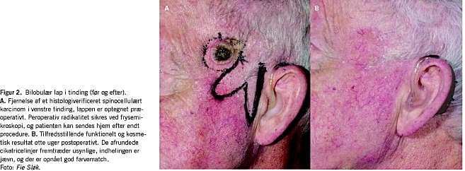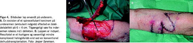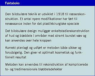 Summary The Bilobed Flap: Reconstruction of nasal and extra-nasal skin defects: Ugeskr Læger 2007;169(50):4337-4340 The bilobed transposition flap has earned its reputation as a reliable and predictable flap, offering aesthetically appealing reconstructive results on difficult nasal defects. Several modifications to the bilobed technique have been made in recent years and there is a tendency towards bigger flaps executed at non-nasal locations. This review describes the development since Esser's original design, and summarizes present knowledge on bilobed flap repair. Furthermore, insight is offered into the latest indications for non-nasal reconstructions.