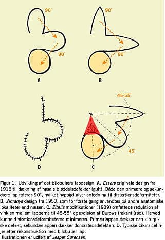 Den bilobulære lap beskrives første gang i tysk medicinsk litteratur i 1918 som en enkeltstadieprocedure til rekonstruktion af nasale bløddelsdefekter (Esser). Det innovative ved metoden var, at fjerntliggende hudoverskud blev tilgængeligt, hvorved næsens topografi kunne rekonstrueres. Esser anbefalede en vinkel mellem de to lapper på 90° (Figur 1A). Den kraftige rotation gav dog ofte anledning til deformiteter, som ofte krævede en senere korrektion. Metoden justeredes af Zimany (1953), som også anvendte den på andre anatomiske lokaliteter (Figur 1B).