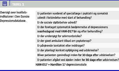 I 2009 blev der for unipolar depression hos voksne taget initiativ til at udvikle en landsdækkende klinisk kvalitetsdatabase, som nu er videreført i regi af Regionernes Kliniske Kvalitetsudviklingsprogram. Databasen blev implementeret nationalt den 1. januar 2011 med det formål at måle kvaliteten af udredning og behandling vha. en række kvalitetsindikatorer, der var fastsat af en tværfagligt sammensat styregruppe (Tabel 1 ). Databasen dækker det sekundære sundhedsvæsen, men skal på længere sigt udbredes til også at omfatte primærsektoren [1, 2].