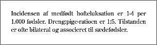I DDH kan følgende kliniske enheder adskilles: 1) Den medfødte eller tidligt erhvervede, reponerbare, komplette hofteluksation, hvor den tætte pasform mellem caput og ledskål er tabt, og hvor caput kan lukseres ind og ud af acetabulum med Barlows (14) og Ortolanis (15) manøvrer. 2) Den teratologiske, irreponible hofteluksation med affinitet til et universelt syndrom (artrogryfose, cerebral parese, Larsens syndrom, diastrofisk dværgvækst, spina bifida, mukopolysakkaridose etc.).