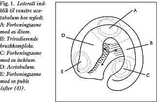 Ved fødslen er acetabulums bruskkompleks færdiganlagt. Bruskkompleksets mediale, ikkeartikulerende væg består af et »triradierende« bruskkompleks: Y-brusken (Fig. 1 ). I periferien af hver flange findes en epifyseal vækstskive mod os ilium, os ischium og os pubis. Acetabulums primære, centrifugale vækstmotor er Y-brusken (4). Et fibro-lipomatøst legeme (pulvinar) er interponeret mellem ledhovedet og acetabulums bund. Labrum supplerer bruskkompleksets laterale afgrænsning. Ledkapslen insererer sig flere millimeter fra labrums mediale kant.