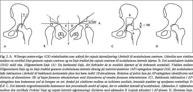 Vinklen (center-edge , CE) mellem en vertikal linje trukket gennem centrum af caput femoris og en linje gennem centrum til acetabulums laterale hjørne blev fastlagt af Wiberg (7) og anvendes til påvisning af såvel lateralisering af caput som acetabulær dybde. Hos raske voksne er CE-vinklen 20-40º (8) (Fig. 2A ).