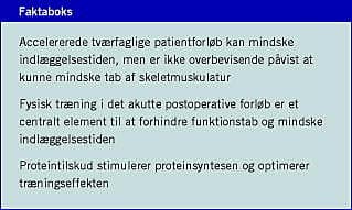 Der er samlet evidens for effekten af træning i den postoperative periode, hvor der også kan være supplerende effekt af at indtage proteinholdige fødevarer umiddelbart efter træningen. Derimod er der kun sparsom viden om betydningen af præoperativ fysisk aktivitet.