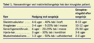 Såvel muskelmassen som muskelstyrken falder hurtigt ved inaktivitet, og hos yngre personer kan blot 7-10 dages sengeleje reducere styrken i større muskelgrupper med 10-20%, ligesom mineralindholdet i knogler og bindevævsstyrken i sener og ledbånd nedsættes [4]. F.eks. vil lårets muskelstyrke være reduceret med op til 40% efter 3-4 ugers immobilisering (Tabel 1 ), hvilket hovedsageligt skyldes et tab af muskelmasse forårsaget af en nedsat proteinsyntese kombineret med en accelereret proteinmetabolisme [4].