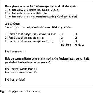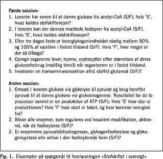 Læringen bliver mere effektiv, hvis deltagerne er aktive, dvs. på en bevidst måde opbygger komplekse kundskabsnetværk. Verbalisering bidrager betydeligt til denne proces [1]. Med henblik på at opnå forbedret læring er der udviklet såkaldt studenteraktiverende arbejdsformer, f.eks. problembaseret læring (PBL) og casemetode. De er effektive, men resursekrævende, både hvad angår træning af lærere og lærertid [2]. Simplere metoder til at forbedre læringsprocessen hos universitetsstuderende er derfor af stor interesse. I den konventionelle 45-minutters-forelæsning falder koncentrationen almindeligvis efter ca. 20 minutter. Studenterne bliver uopmærksomme, og læringen er ikke længere optimal [3, 4]. Dette forløb kan modvirkes ved at føje aktiverende momenter ind i forelæsningen. I mindre grupper kan det lade sig gøre ved en diskussion mellem forelæseren og auditoriet, men en sådan diskussion bliver ikke effektiv med store grupper af studerende. Her kan man i stedet gøre følgende: Læreren har på forhånd forberedt en række spørgsmål vedrørende det stof, som gennemgås ved forelæsningen. Forelæsningen afbrydes, og de studerende opfordres til at tage stilling til og herefter besvare spørgsmålene. Princippet er beskrevet i flere pædagogiske lærebøger og artikler [3, 4]. Vi ønskede at afprøve og evaluere et sådant koncept på nogle forelæsninger i biokemi for medicinstuderende på ny studieordning på fjerde semester på lægestudiet ved Københavns Universitet med henblik på at undersøge tidsforbrug i forelæsningstimen, nødvendig uddannelse af forelæseren og accept af metoden hos de studerende.