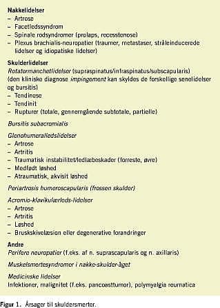 Skulderproblemer (oftest smerter) er hyppige og ofte årsag til henvendelse til den praktiserende læge [1]. Der er forskellige årsager til disse problemer (Figur 1 ).