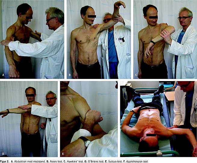 O'Briens test, som udføres ved en fleksion til vandret mod undersøgeren på en let adduceret overarm med henholdsvis indadrotation (Figur 2D) og udadrotation i skulderen (og albuen), er positiv for skader på den øverste del af ledlæben, hvis den især medfører smerter ved indadroteret skulder [4]. Crank-test udføres ved at presse proksimalt i humerus længderetning og foretage indad- eller udadrotation [5]. Dette medfører smerter ved ledlæbeskader.