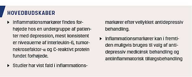 og betablokkere [11]. En metaanalyse fra 2017 viste endvidere et fald i niveauerne af IL-6 (effect size (ES) = –0,45; p < 0,001), TNF-α (ES = –0,20; p = 0,015) og IL-10 (ES = –0,57; p = 0,012) efter SSRI-behandling [12]. IL-6 og TNF-α er begge proinflammatoriske cytokiner, hvorimod IL-10 er et antiinflammatorisk cytokin – en subanalyse viste dog, at IL-10-niveauer alene var forhøjet blandt patienter, der fik antidepressiv medicinsk behandling, hvorfor niveauerne ifølge forfatterne muligvis kan tilskrives en indirekte effekt af medicinen. I et studie har man dog fundet et fald i cytokinniveauer efter kognitiv adfærdsterapi, også uafhængigt af medicinsk behandling. Man fandt desuden kun et signifikant fald i cytokinniveauer hos patienter, som responderede på behandlingen [4]. Dette rejser spørgsmålet om, hvorvidt antidepressiva per se har antiinflammatorisk effekt, eller om denne effekt blot er en følge af et fald i depressive symptomer.