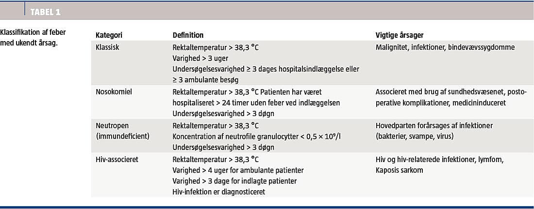 Feber af ukendt årsag (FU) er traditionelt defineret som [1]: 1) rektaltemperatur > 38,3 °C, 2) varighed mindst tre uger og 3) ætiologi uafklaret efter mindst en uges intensiv udredning under hospitalsindlæggelse. Definitionen er foreslået ændret på grund af tiltagende brug af ambulant udredning, således at man kan nøjes med tre dages indlæggelse efterfulgt af tre ambulante besøg eller alternativt en uges intensiv udredning i ambulant regi [2].