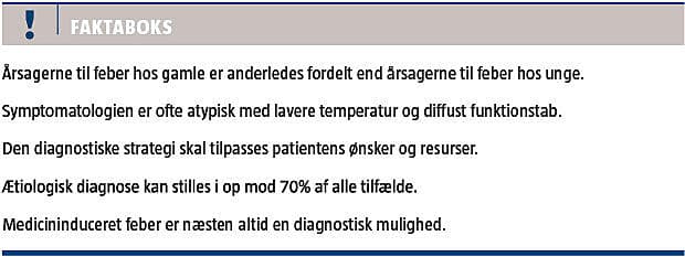 Det er reglen mere end undtagelsen, at et ældre menneske fejler flere ting på én gang. Derudover kan nogle abnorme fund f.eks. bakteriuri være klinisk betydningsløse [12]. Det betyder, at man i udredning af feber hos gamle altid må være opmærksom på, at der kan være flere årsager til feberen, og at der kan være abnorme fund, som slet ikke har noget med feberen at gøre, jf. den indledende case.