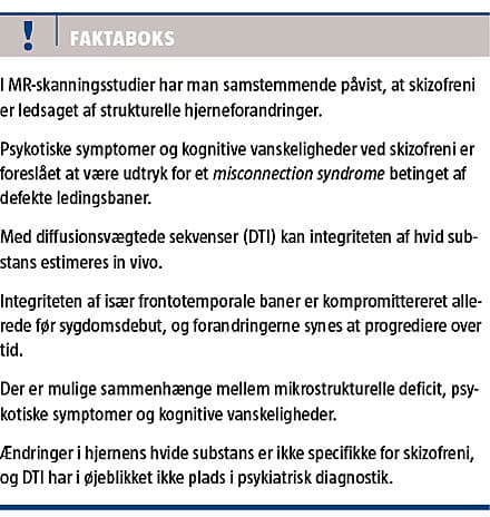 Skizofreni er en hjernesygdom, som er karakteriseret ved et spektrum af fundamentale ændringer i individets tænkning og forestillingsverden. Med udbredelsen af især MR-skanninger fra midten af 1980’erne [1] er det veletableret, at skizofreni er ledsaget af strukturelle hjerneforandringer [2]. Hidtidige MR-skanningsstudier af grå substans og ventrikelvolumen har bidraget væsentligt til forståelsen af sygdomsprogressionen og prognosen [3], men biologien bag sygdommens karakteristiske psykotiske symptomer er fortsat ufuldstændigt belyst.