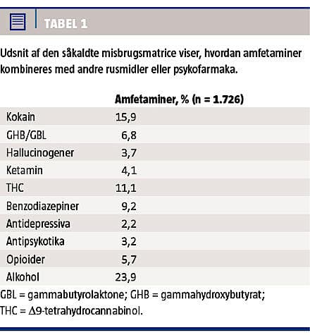 Tabel 1, den såkaldte misbrugsmatrice, bygger på Giftlinjens erfaringsdatabase og viser, hvorledes amfetaminer kombineres med forskellige rusmidler eller anvendes sammen med ordinær psykofarmakologisk behandling. Komedicinering med benzodiazepiner, antidepressiva eller antipsykotika forekommer ved over 10% af henvendelserne om amfetaminer, hvorimod kombination med »nonpsykofarmakologisk« behandling er negligeabel. Tallene vil naturligvis påvirkes af den usikre rusmiddelanamnese, ikke alene pga. patienternes psykiske og fysiske tilstand, men også fordi gadenomenklaturen for amfetamin og dets derivater er yderst variabel, så brugeren og behandleren kun sjældent kender indhold og styrke, og der kun i få tilfælde foretages konfirmatoriske analyser. Således har de retskemiske institutter for nylig beskrevet, at brandet »Ecstasy«, som tidligere var synonymt for MDMA, i dag dækker over en lang række psykoaktive substanser [4].