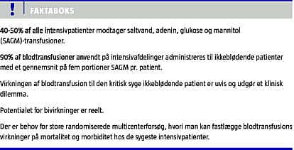 Transfusion af saltvand, adenin, glukose og mannitol (SAGM) benyttes ofte i behandlingen af kritisk syge patienter, der er indlagt på en intensivafdeling [1]. I internationale studier er det vist, at 40-50% af alle intensivpatienter får SAGM-transfusioner, og mere end 90% af blodtransfusionerne administreres til ikkeblødende patienter med et gennemsnit på fem portioner SAGM pr. patient [2-4].