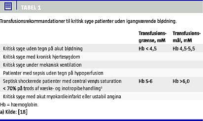 Blodtransfusion til kritisk syge patienter uden blødning er generelt rekommanderet ved hæmoglobin < 4,5 mM i henhold til American College of Critical Care Medicine [18]. I den akutte behandling af patienter med svær sepsis/septisk shock anbefales blodtransfusion som et supplement til væsketerapi og vasoaktive stoffer. Surviving Sepsis Campaign anbefaler, at der i den tidlige fase (< 6 timer) gives blod indtil hæmatokrit på > 30% (ca. 6 mM), hvis patienten efter væskeresuscitation og eventuelle inotropika ikke har opnået en central venøs iltsaturation > 70%. Efter initial resuscitation gives blod ved hæmoglobin < 4,5 mM til et niveau på 4,5-5,6 mM [19] (Tabel 1 ).
