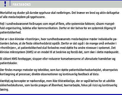 Summary Patient safety can be ensured in clinical microsystems Ugeskr Læger 2012;174(45):2780-2784 Patients, health-care professionals and the public expect safe health care. The system, however, is not safe and patients are being harmed. Workplace and organizational conditions and human factors contribute to these harms and a system approach is needed to avoid them. In clinical microsystems (CMS), the frontline units of health care, staff and patients can make care safer by learning about their system, its processes, members and purposes. Approaches from patient safety should be integrated in the daily work of every member of the CMS to reduce risk, implement safe practices and learn from errors. We summarize methods for use in CMS and offer ideas for fostering a proactive culture of patient safety.