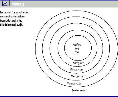 Anatomien i dette system er som følger (Figur 1 ): I centrum er patienten og de pårørende, der hjælper sig selv. Når det ikke lykkes, hjælper læger, sygeplejersker og andet personale i et »mikrosystem«, f.eks. en praksis eller et sengeafsnit, der består af flere led. Diagnostik og behandling sker normalt i flere mikrosystemer, som er mere eller mindre forbundet med hinanden i et mesosystem, f.eks. et sygehus. Sektorovergange, f.eks. en sygehusindlæggelse, sker derimod i et makrosystem som en region. Vi fokuserer her på mikrosystemet som den organisatoriske enhed, hvor klinikere i deres daglige arbejde kan forbedre patientsikkerheden.